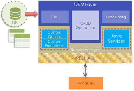 3. You, as an App Developer, can access the Entities from the ORM Layer, write custom queries, procedures and Java Services to extend the database functionality.