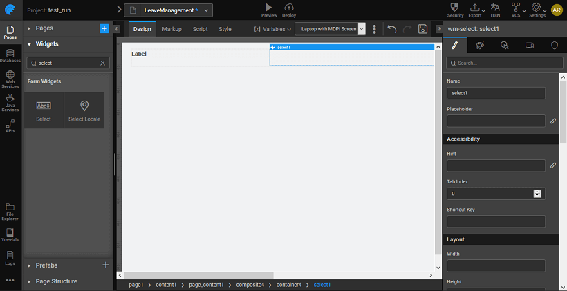 WaveMaker offers various ways to use the Select widget. This section elaborates on all the options available. These various options pertain to how the data displayed in the drop down list is set. Running the app will display the select widgets with the label showing the selection.