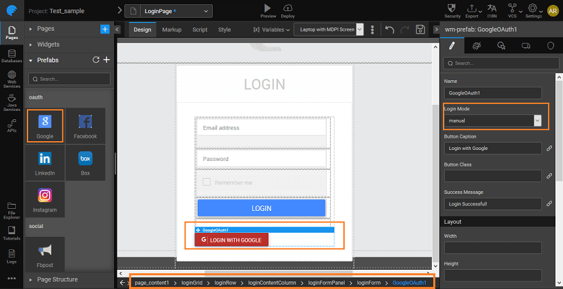 • Create an application using WaveMaker. Drag and Drop the Google OAuth PreFab onto the canvas. You can use the default login page created by WaveMaker.
