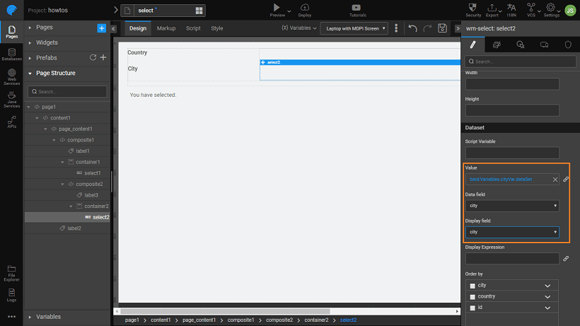 3. Bind the first Select widget to the _citylistingVar _dataset. Set the Display Field and Data Field to the Country field of the dataset.