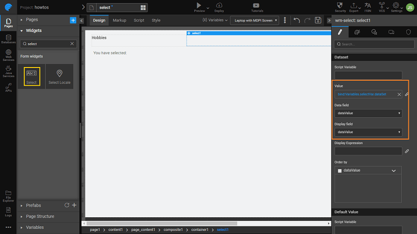 4. Set the Data field value to the dataValue of the model variable. This is the value that is selected by the user.