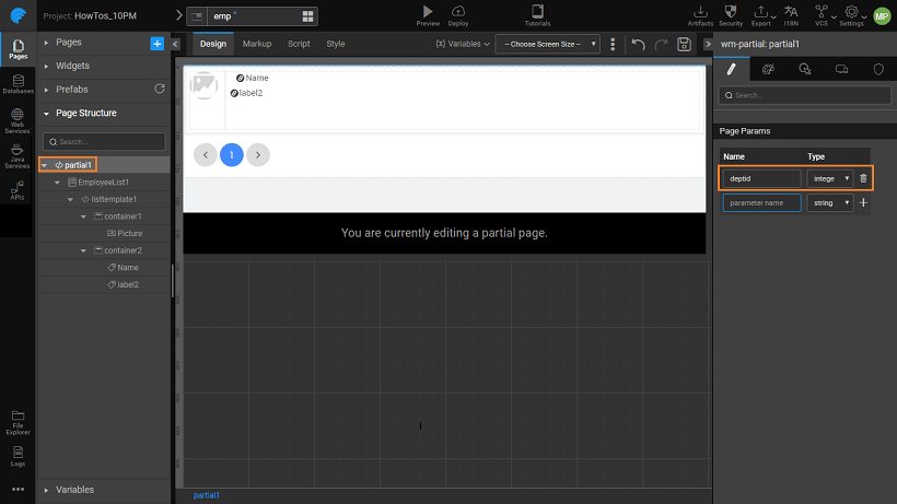 3. Since Employee details have to be filtered based upon the selected Department, create a page parameter for the Employee partial page. Use this parameter to filter the list items.