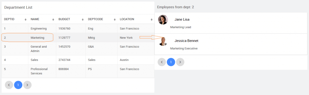 1. Department page listing the departments in a Data Table and Employees from the selected department in a List,