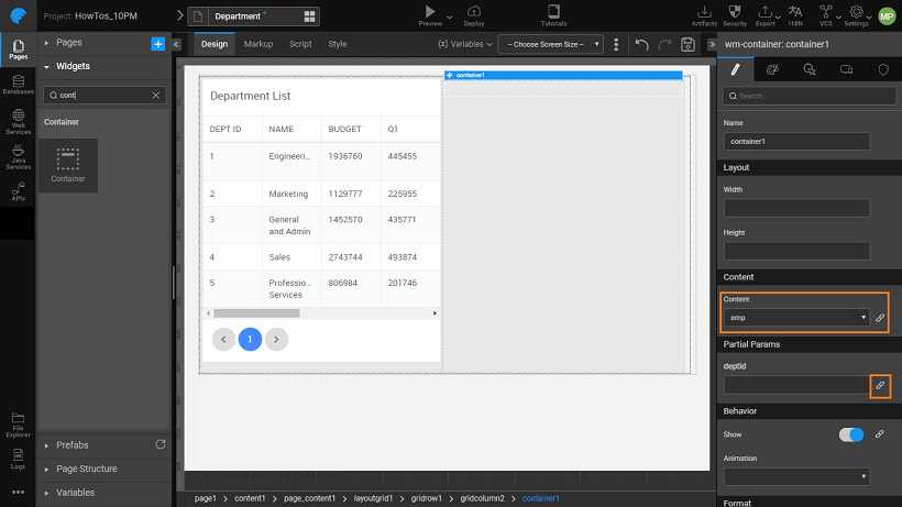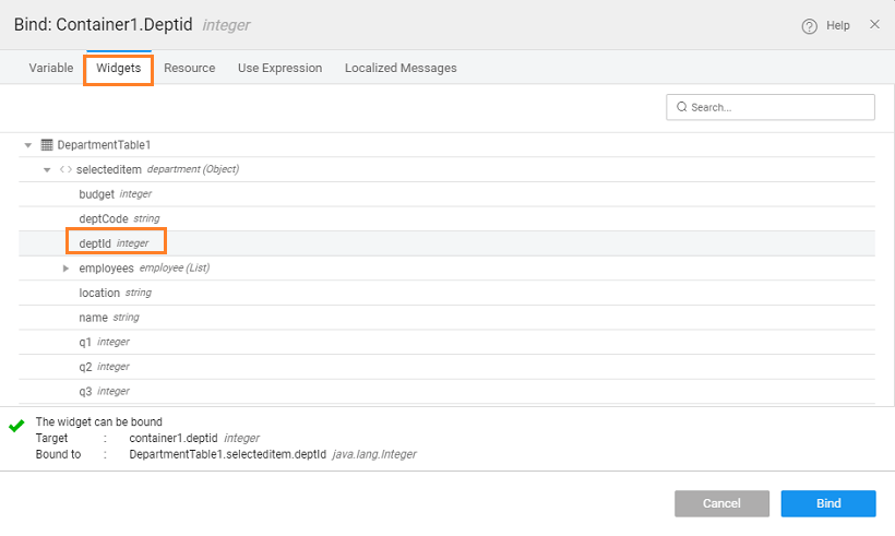 2. From the Widgets tab, select the deptid from the selectedItem of the grid