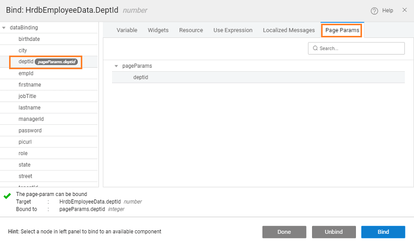 4. Bind the page parameter to the selected department id.