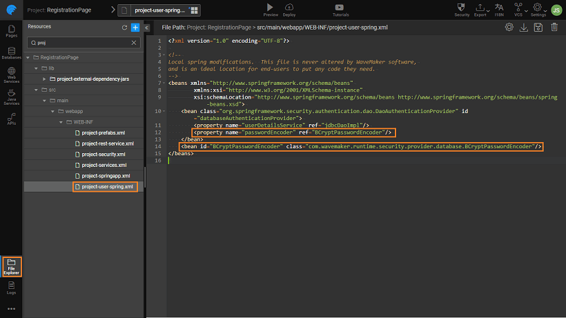 <bean id="myPasswordEncoder" class="com.wavemaker.runtime.security.provider.database.MyPasswordEncoder"/>