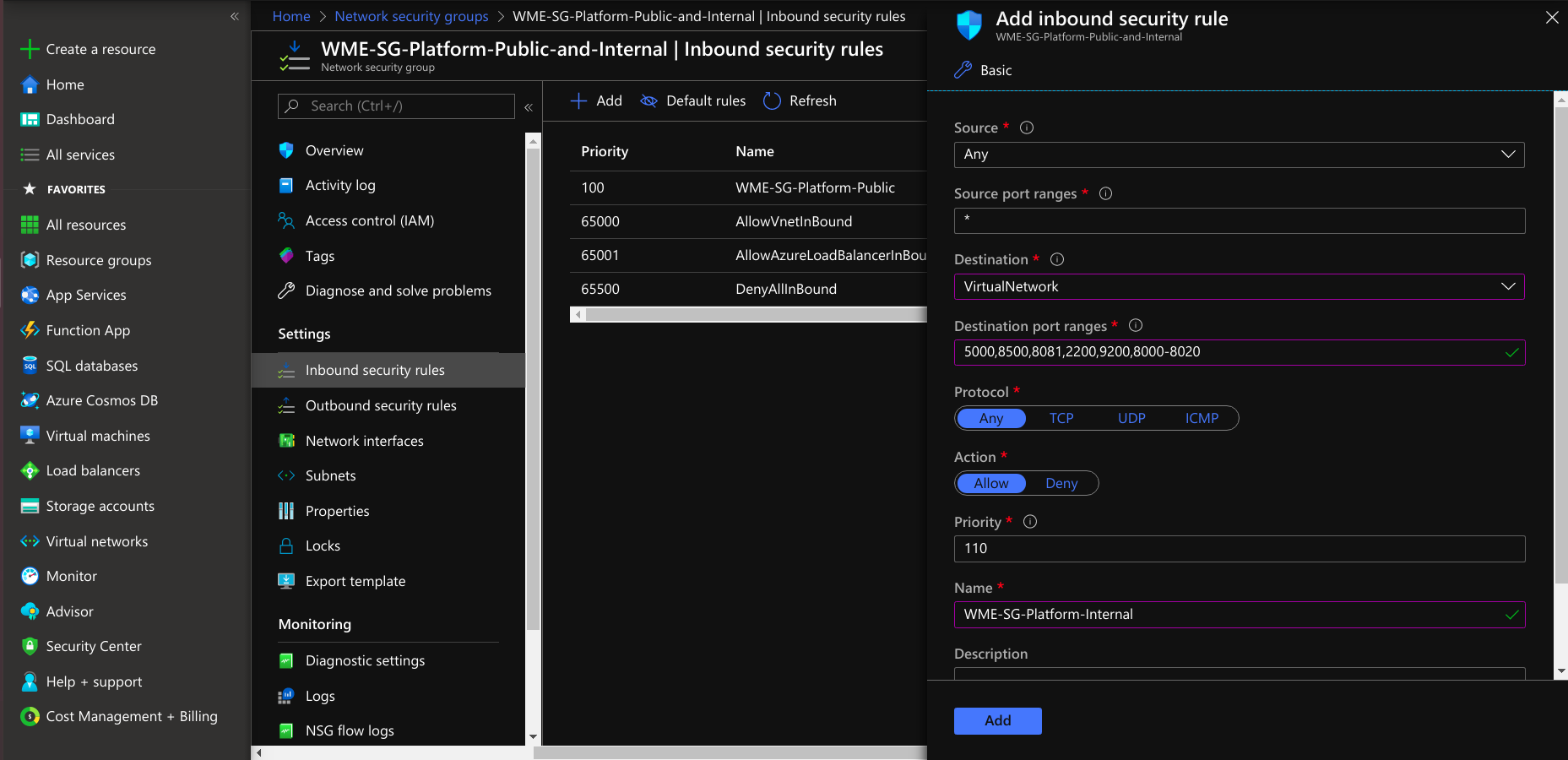 • At Configure network security group select WME-SG-Platform-Public-and-Internal for Platform Virtual Machine and select WME-SG-Workspace-Internal for Studio Workspace/App Deployment Virtual Machine(Workspace Virtual Machine / AppDeployment Virtual Machine).