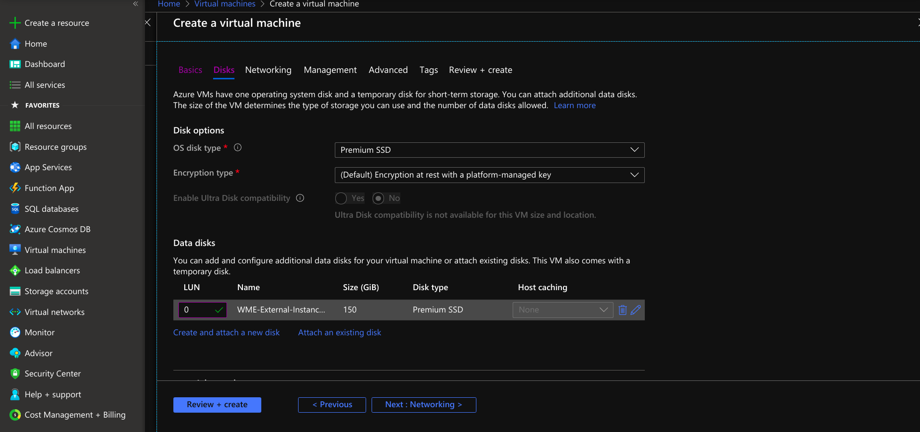 - Create a disk for external usage at the disk section and provide a minimum of 100GB size with premium SSD disk type.