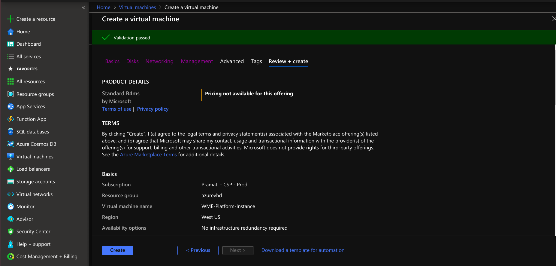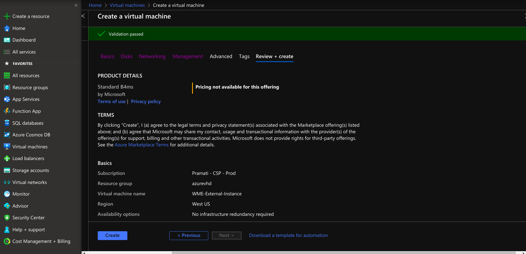 - After reviewing the virtual machine, select the creation option for creating a virtual machine.