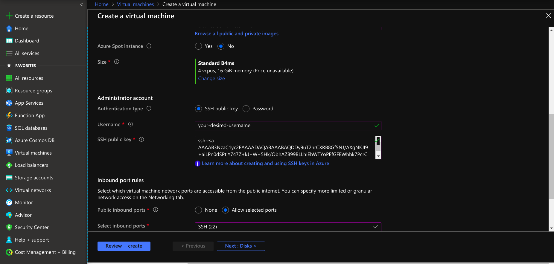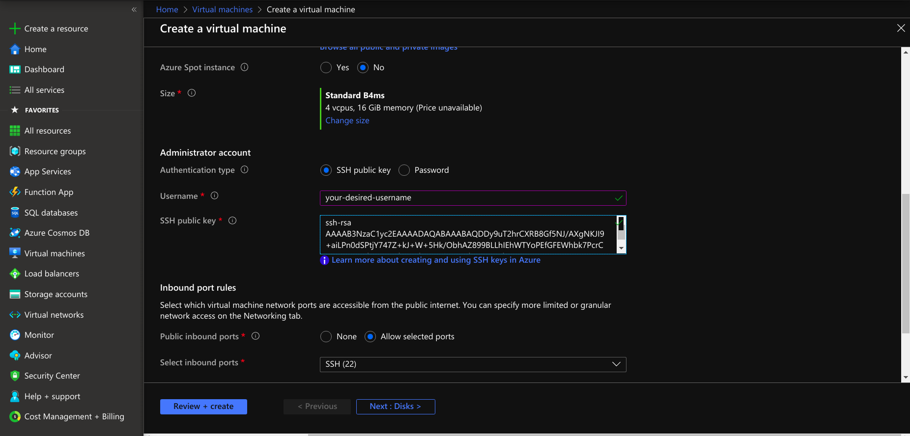 - Select the authentication type password or ssh public key for launching a virtual machine.