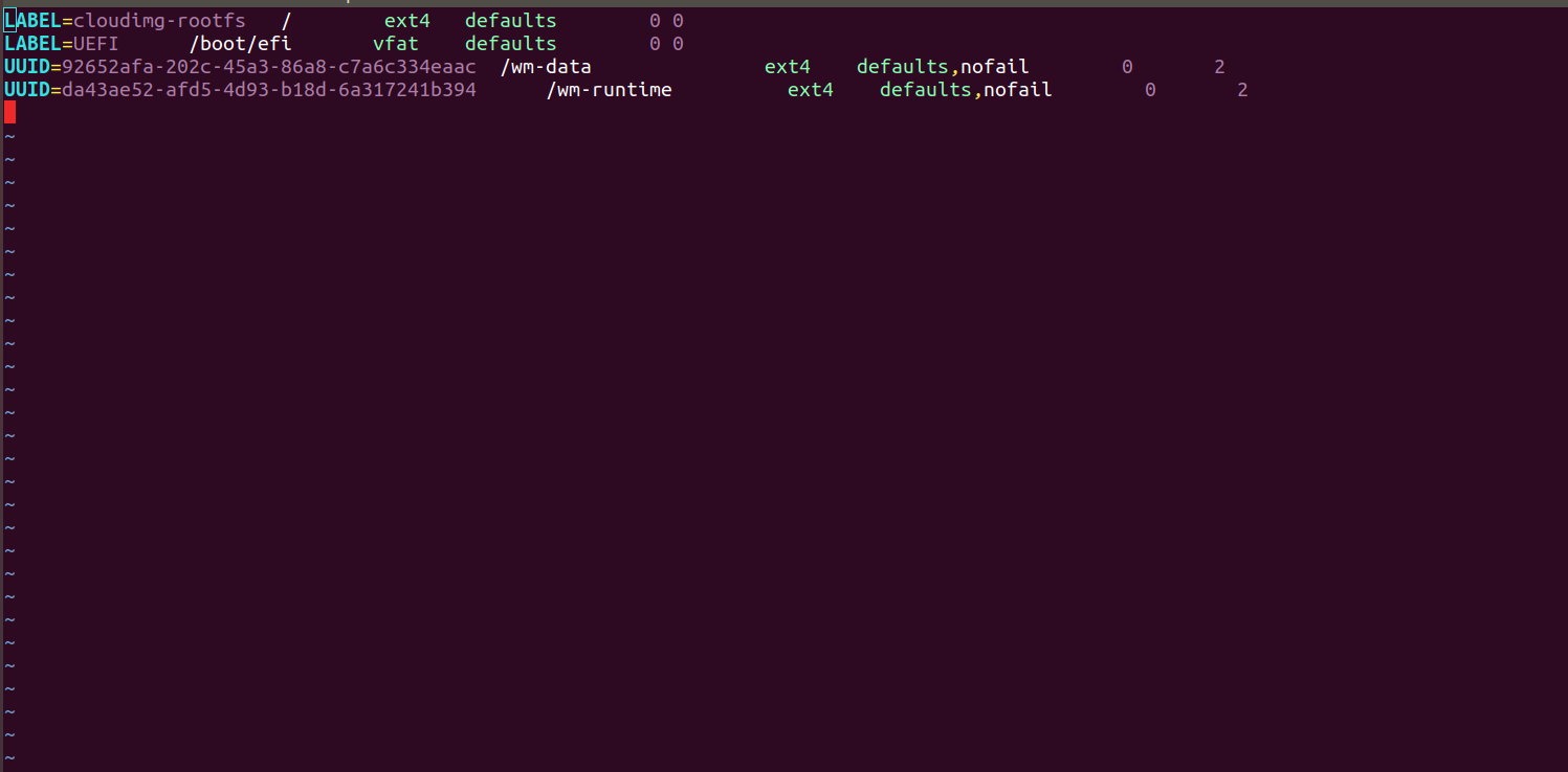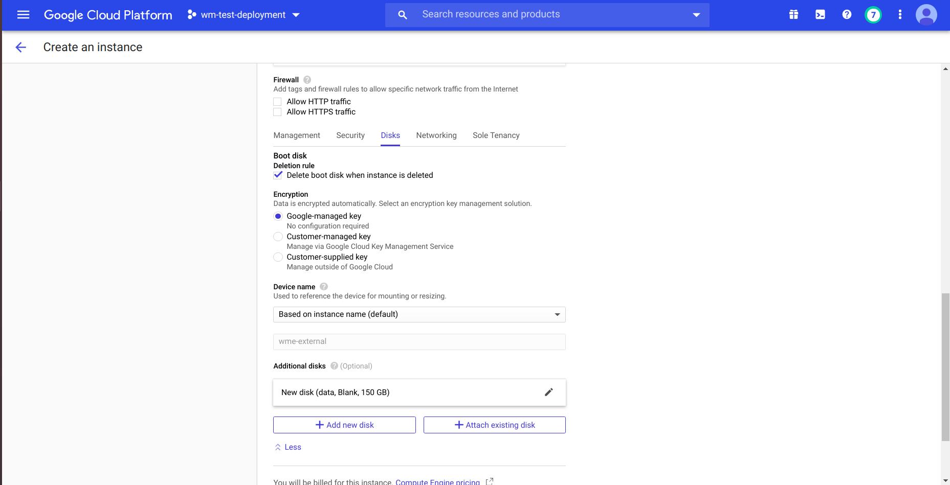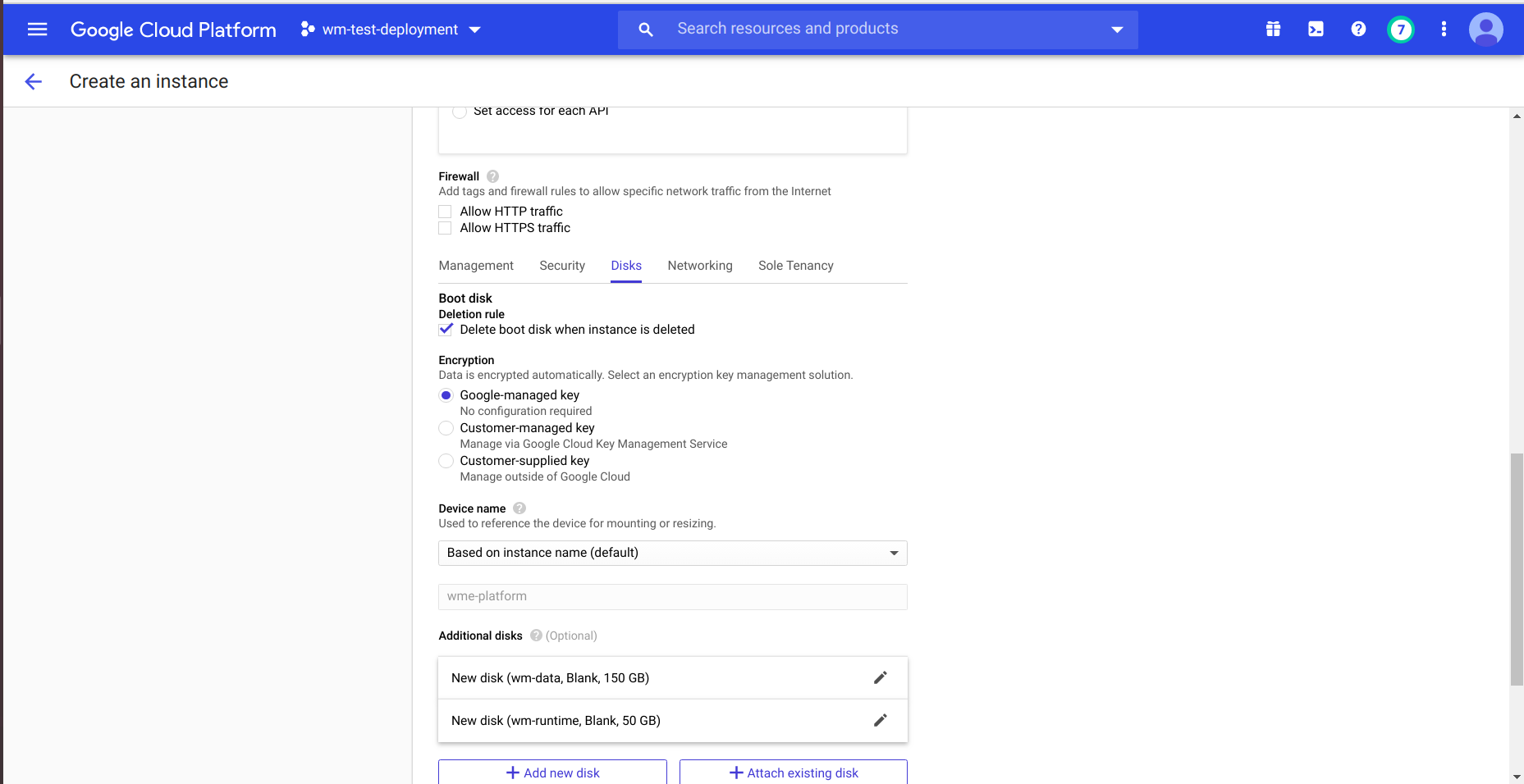 - At disk section create disks for wm-data and wm-runtime with 150 and 50 GiB.