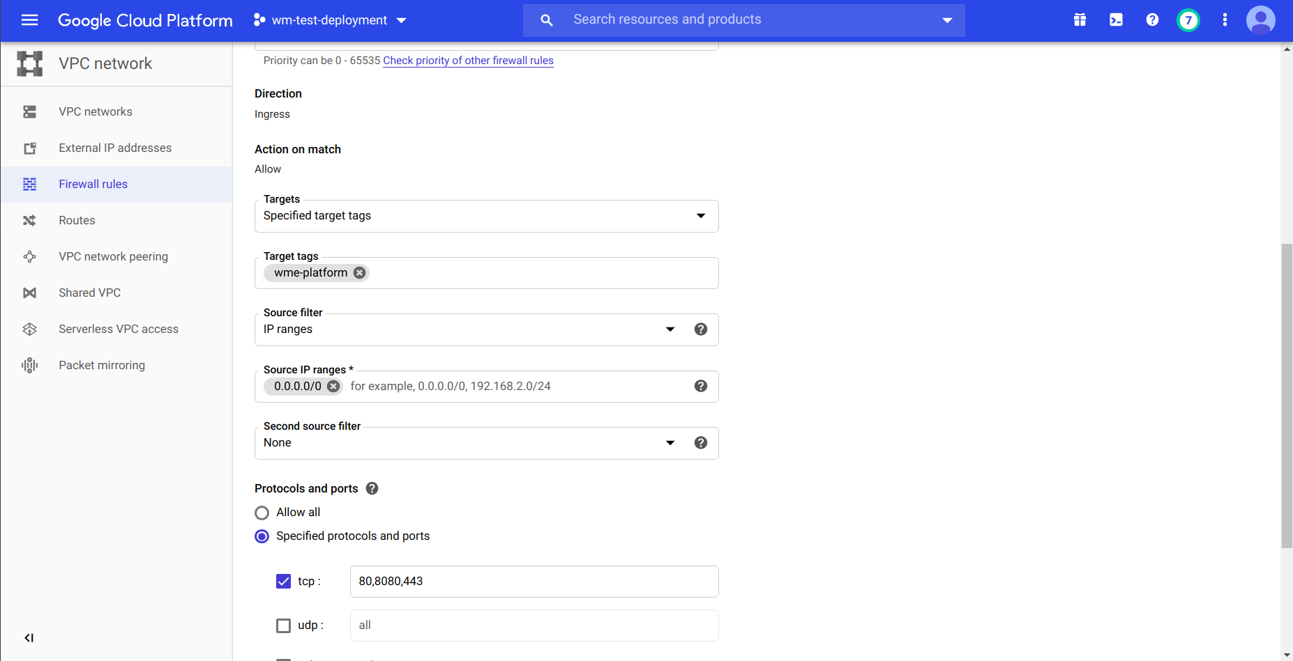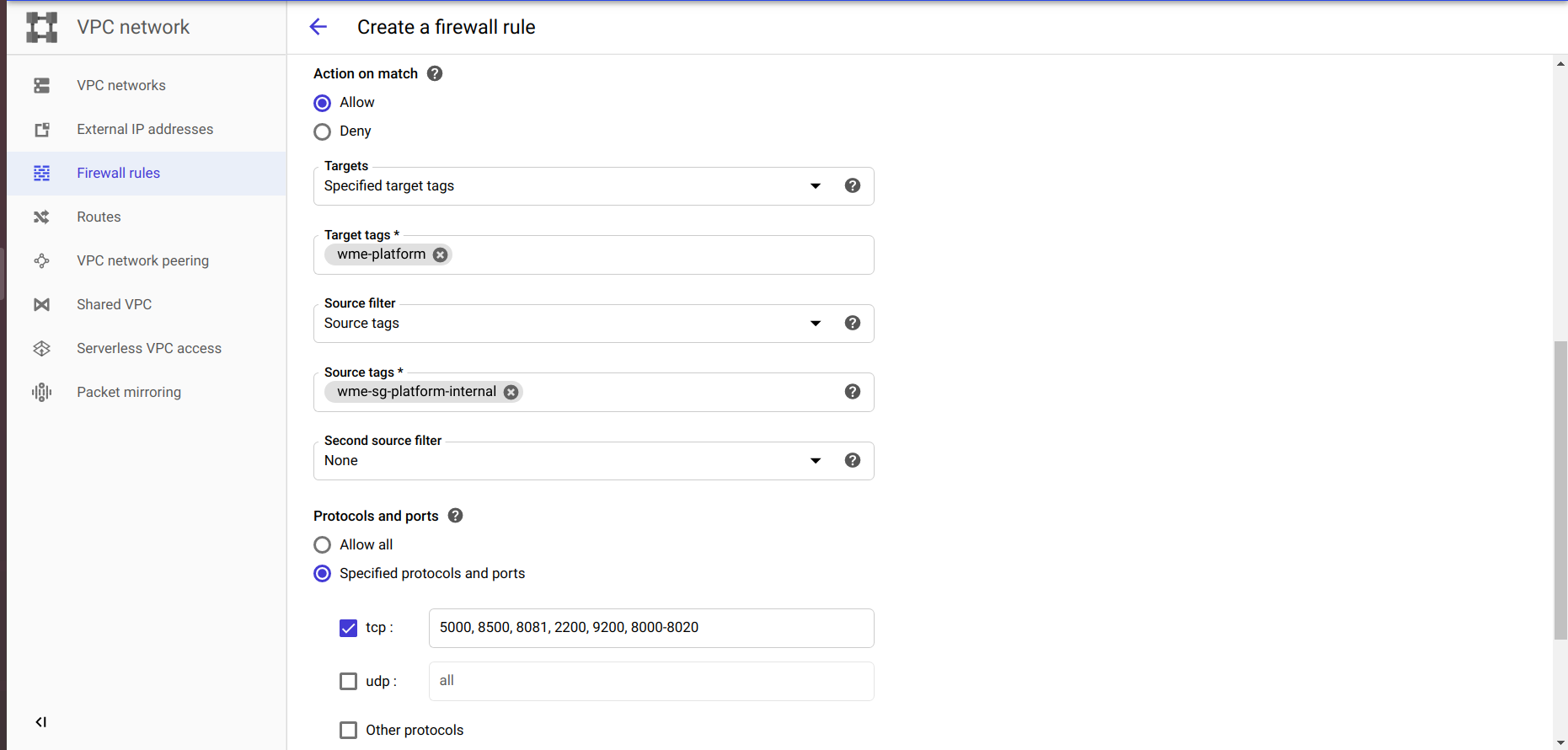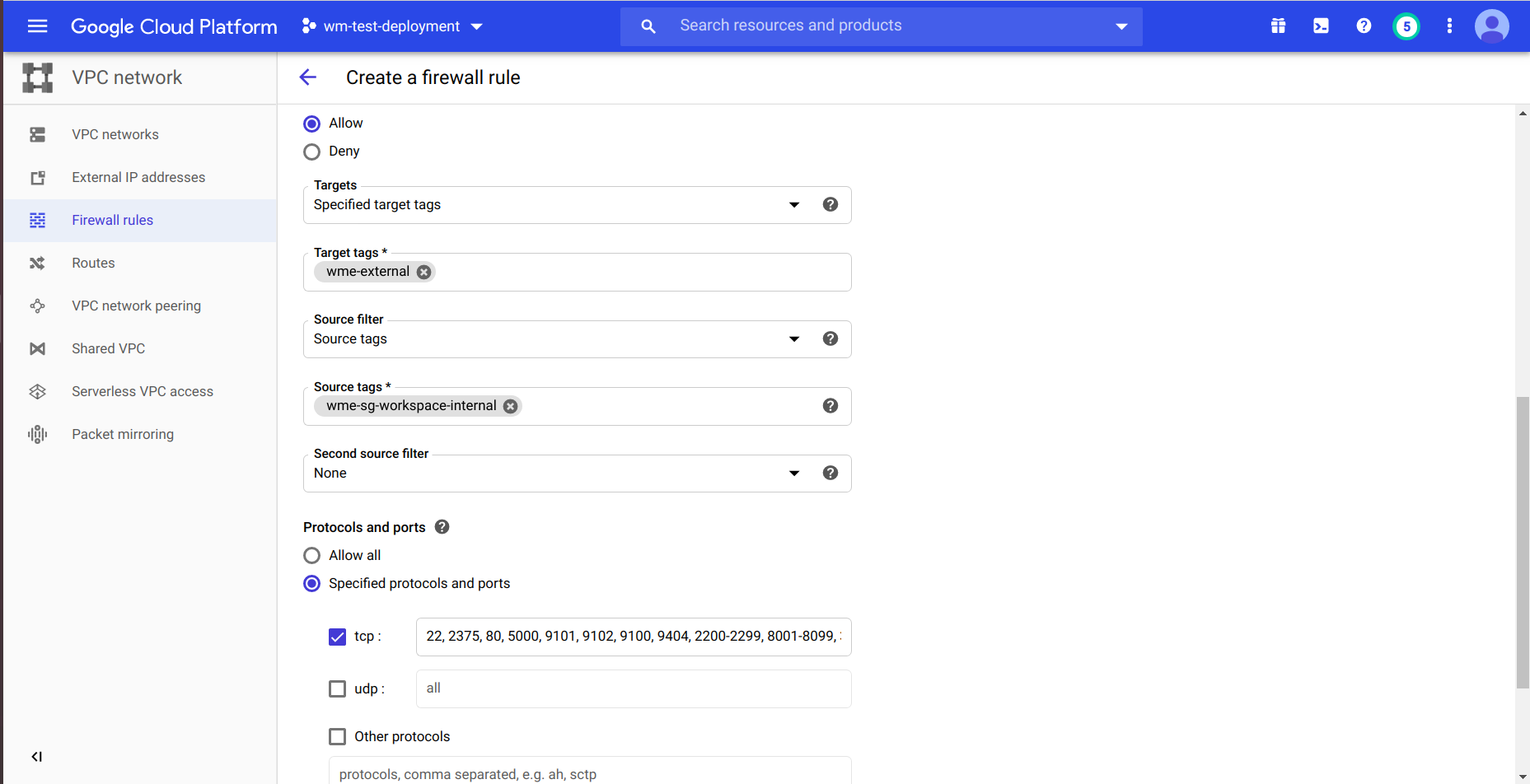 - Select target type and source filter type. by using the target we can connect the firewall rule to Instance. example the which Instance have target tag the firewall is connect to that Instance and by using the source we can open ports to specific Instance. example the which Instance have a source tag the ports will be open to that Instance.we provide this tags at network section during the Instance creation.or else you can select your own Target and Source methods.
