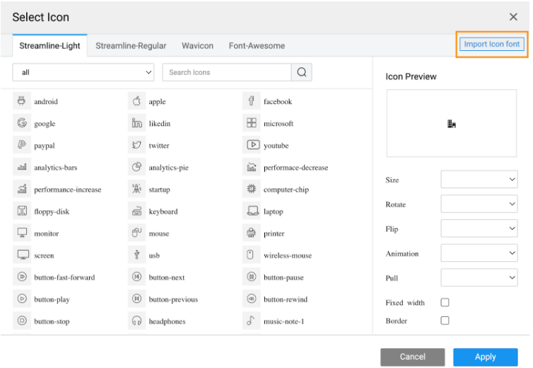 Custom Icon font families can now be imported into the studio using this feature. It can be imported in two ways.