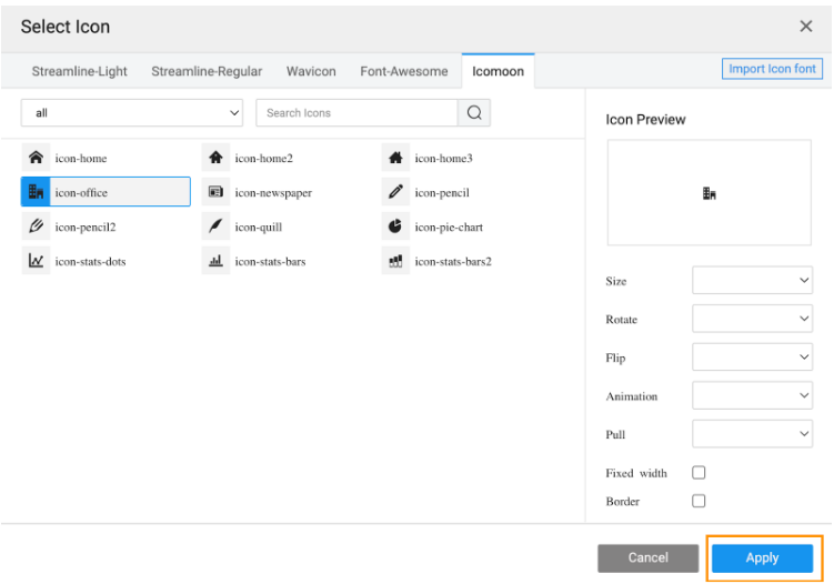 1. Open the Select Icon dialog to view the uploaded icons family.