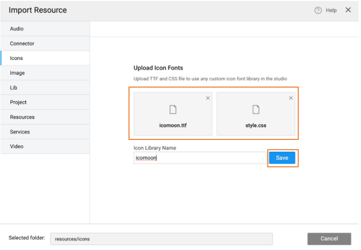 1. Upload the ttf and CSS files of the icon family and enter the library name. Click Save.